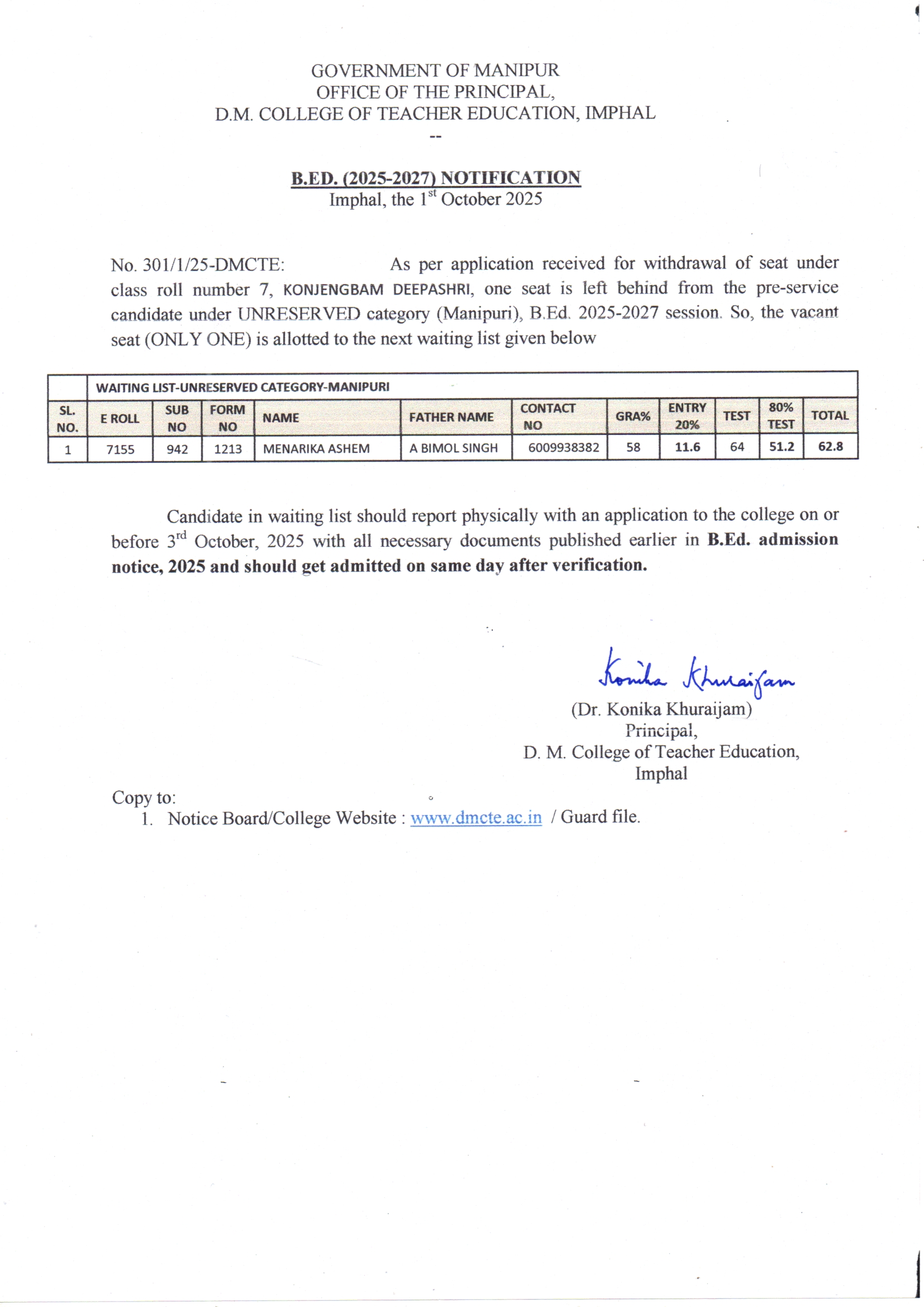 » 1 SEAT VACANT NOTIFICATION, UNRESERVED CATEGORY, MANIPURI, PRE-SERVICE CANDIDATE, BED 2025-2027 SESSION